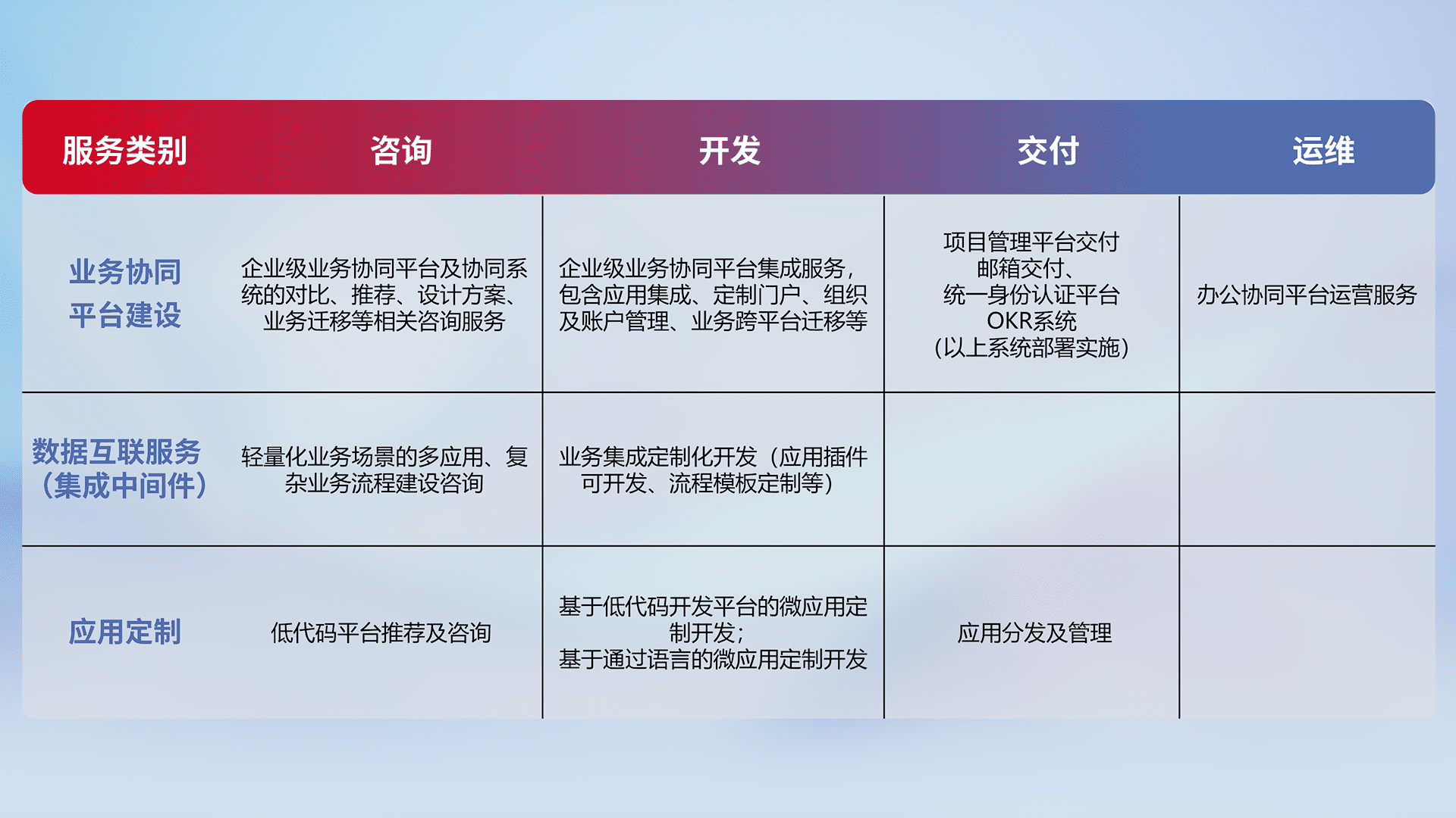 针对钉钉、、、、企微、、、、IDaas等平台级产品提供产品的规划、、、方案、、交付、、、定制化开发等服务,,实现如统一协同办公、、智能客户服务、、、混合会议管理、、智能数据查询、、、等业务场景,,实现数字化转型。。。